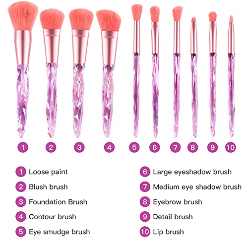 Makeup Brushes 10PCs Set Premium Synthetic Foundation Brush Blending Powder Concealers Eye Shadows Diamond Crystal Make up Brush (Pink)
