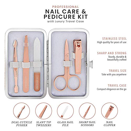 Everything Your Nails Need – Beautifully crafted with travel-size essentials. This nail kit contains all the tools you need; nail file, tweezer, dual cuticle pusher, nail scissors and a nail clipper.