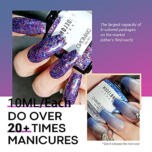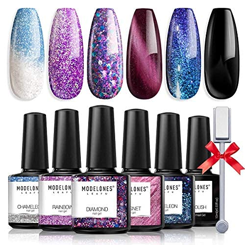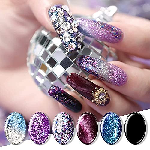 Modelones Gel Nail Polish Set – Cat Eyes Mood Black Glitter Shalack Color Changing Temperature Purple Gel Polish Nail Art Starter Kit with Magnet Stick Soak Off U V LED for Beginner DIY at Home 10ml