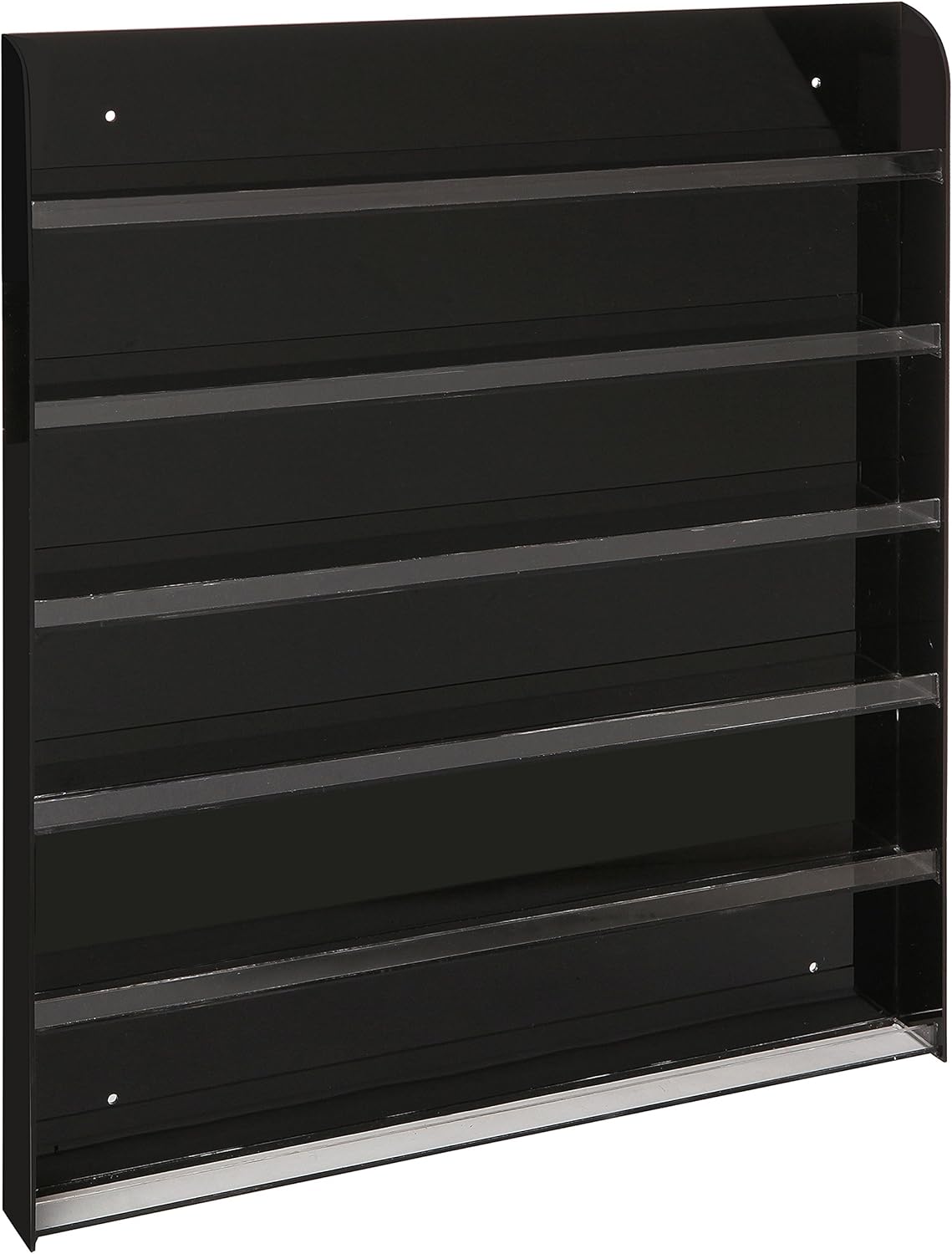Professional quality wall-mounted nail polish display rack featuring a sleek, modern design made up of clear and black acrylic.