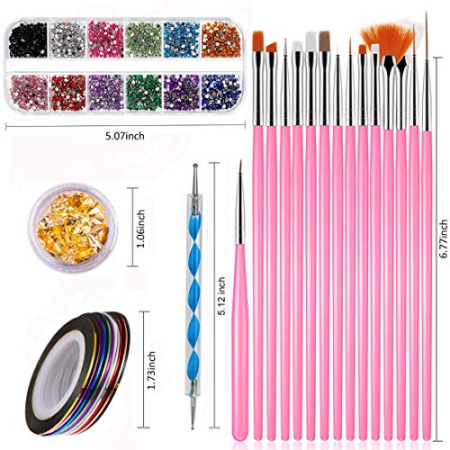 Nail Art Brush, 3D Nail Art Decoration Kit Nail Art Tool with 15pcs Nail Pen Designer 5pcs Nail Dotting Tools 2 boxes Nail Rhinestones 12 Pots Nail Foil Flakes 10 Striping Tape for Nail Art Decoration