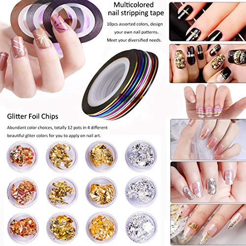 ????【MIXED NAIL DECORATIONS】The sparkly flat back rhinestones provides you a nice selection of colors, shinning and delicately made. The creative foil flakes comes in variety color and well packed with plastic port, gorgeous and easy to work with it. 10 rolls pretty multi-color nail tape stripes and glitter sequins, making your nails look more charming. Create a variety of nail art design with this great all-in-one set of brushes for nail decoration, make your nails more dazzling and attractive.