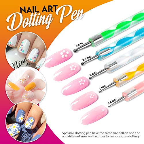 Nail Painting Dotting Tools: 15pcs different nail art brushes for sketching thin lines, animal patterns, flowers and leaves; Dotting rhinestones and other nail accessories; Sweeping away excess glitter sequins. 5pcs nail dotting pen have the same size ball on one end and different sizes on the other for various sizes dotting. 5 different colors, easy to distinguish and find.