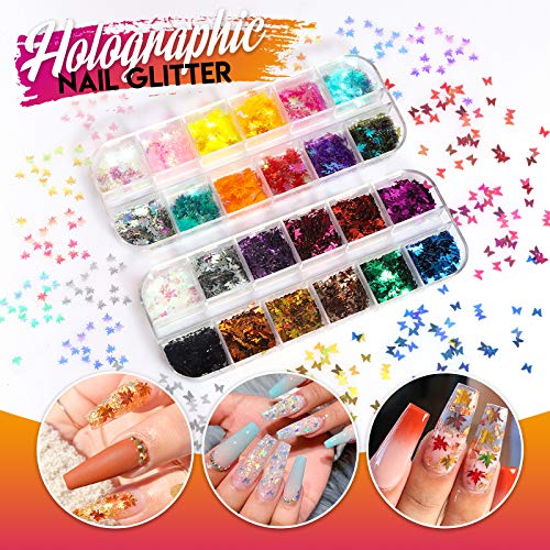 Holographic Nail Glitter: The 3D butterfly paillettes are cute and elegance, look like a real butterfly stay at your nail or face. The maple leaf glitter are special and shiny. Apply these irresistible glitter on nail, hair, eye, lip, face and body to make you glamorous and shining. 10 different colors nail tape line, Self-adhesive, no glue is needed, clean and convenience for use.