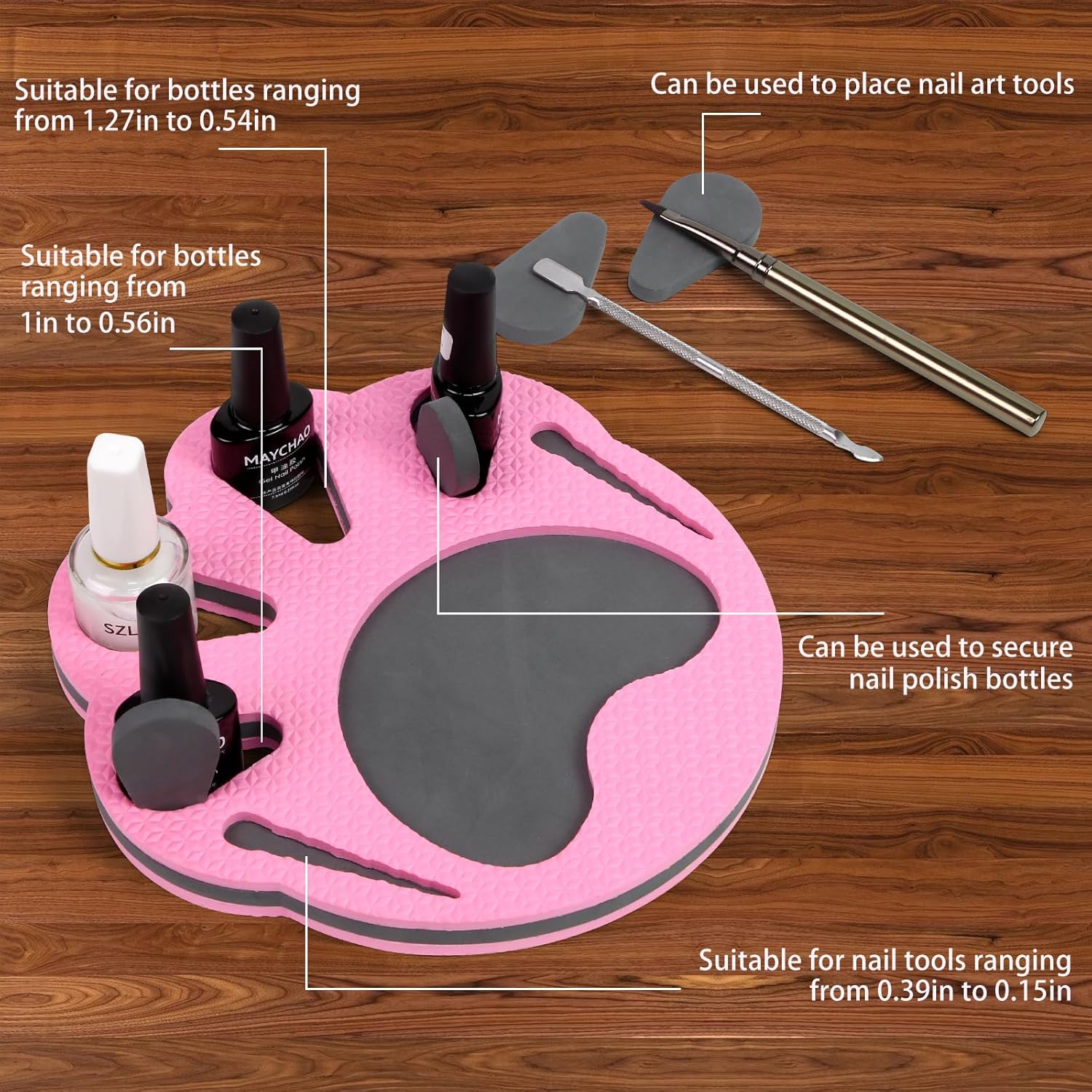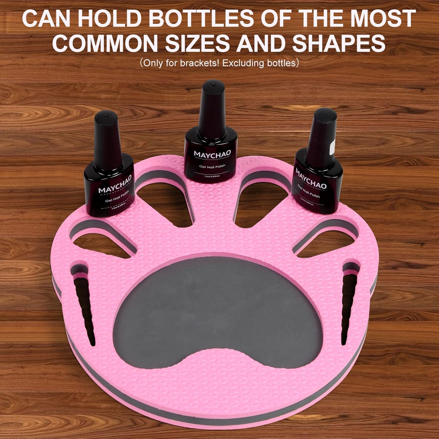 nail polish bottle holder can accommodate multiple nail polish bottles and manicure tools of different shapes and sizes. If needed, you can tilt small bottles to secure them in place and position them at any convenient angle for easy access as the bottles empty