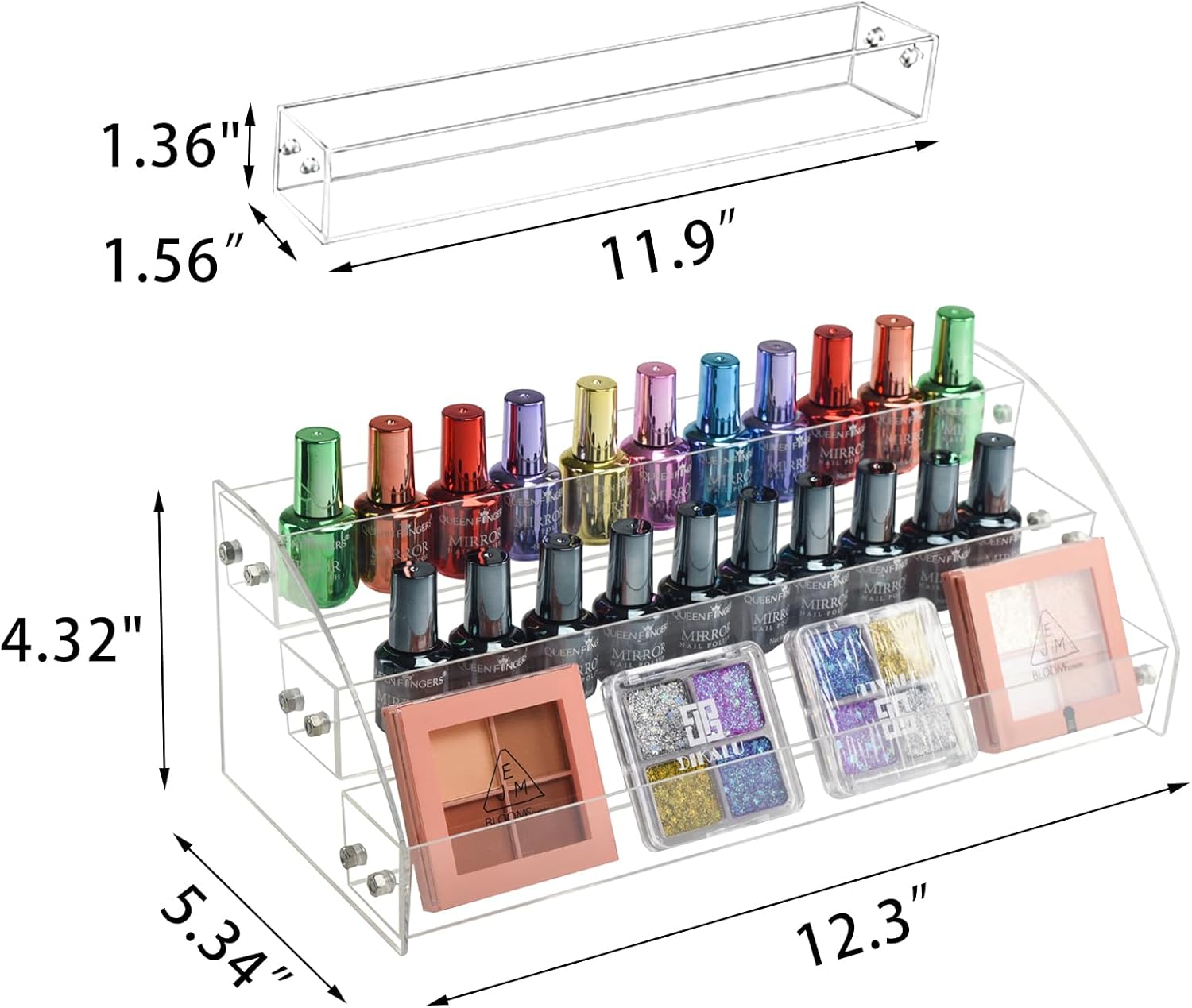 Size: Nail polish display rack measures 12.3 x 5.34 x 4.32 inch; Each layer measures 11.9 x 1.56 x 1.36 inch. Fits small bottles up to 1.47 inches in diameter.