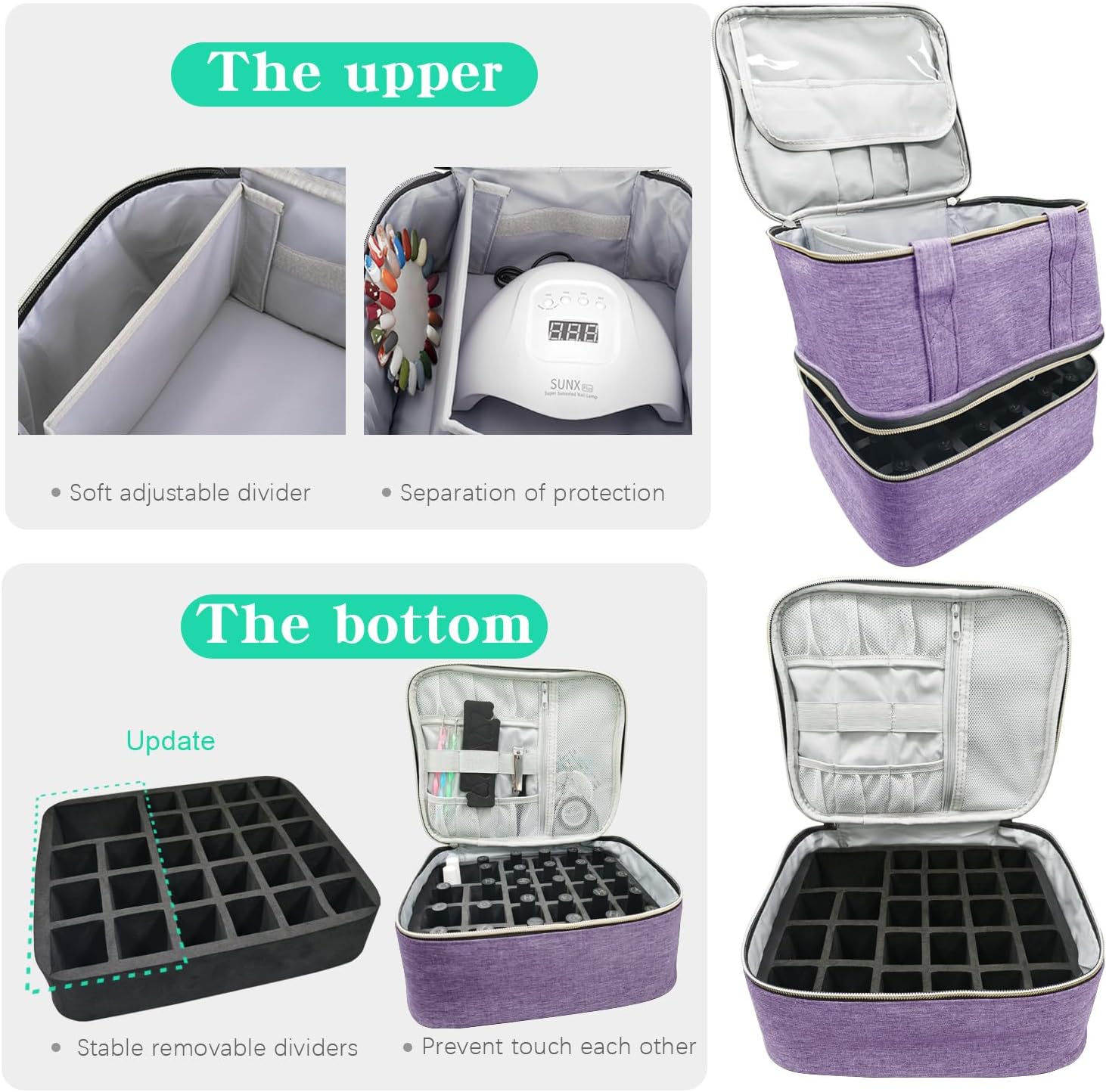 💕【Updated Section】: The upper layer can hold nail lamp, the multiple pockets can fits for nail brushes, cutters, stickers, and other nail art supplies. The bottom has a nice liner to store bottles and keep them from breaking, set with detachable EVA divider can securely hold up to 30pcs of 10-15ml(0.5 fl.oz) nail polish or oil cases, updated slots for big bottles