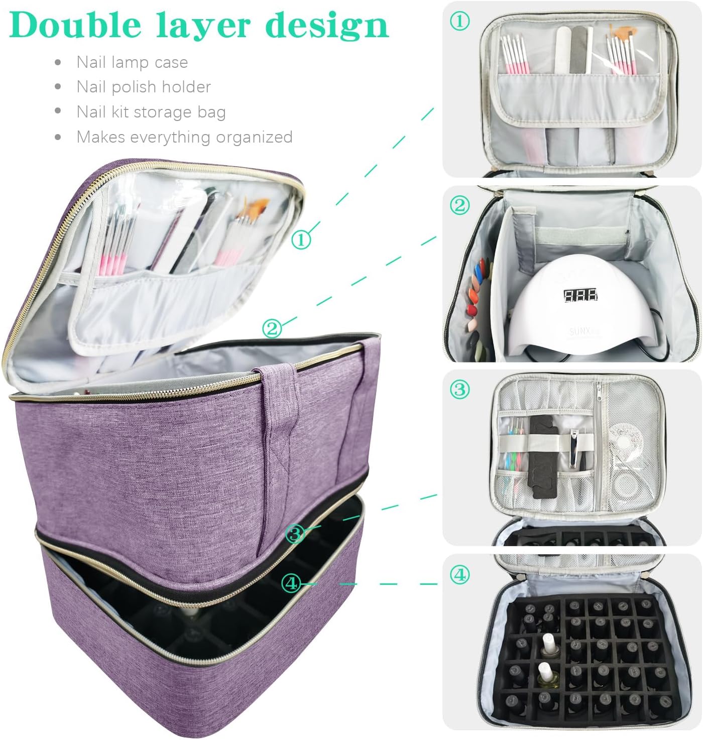 💕【Organized & Safe】: Nail Polish Organizer has two layers design allow this nail polish storage bag great for organizing gel nail polish kits. The durable sponge divider gives a sturdy shape while protecting your nail tools from bumps. Soft padded interior to protect nail polish bottles and nail dryer. The pouches in the lids are perfect for files and other tools