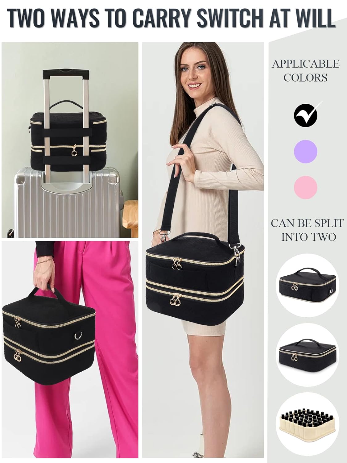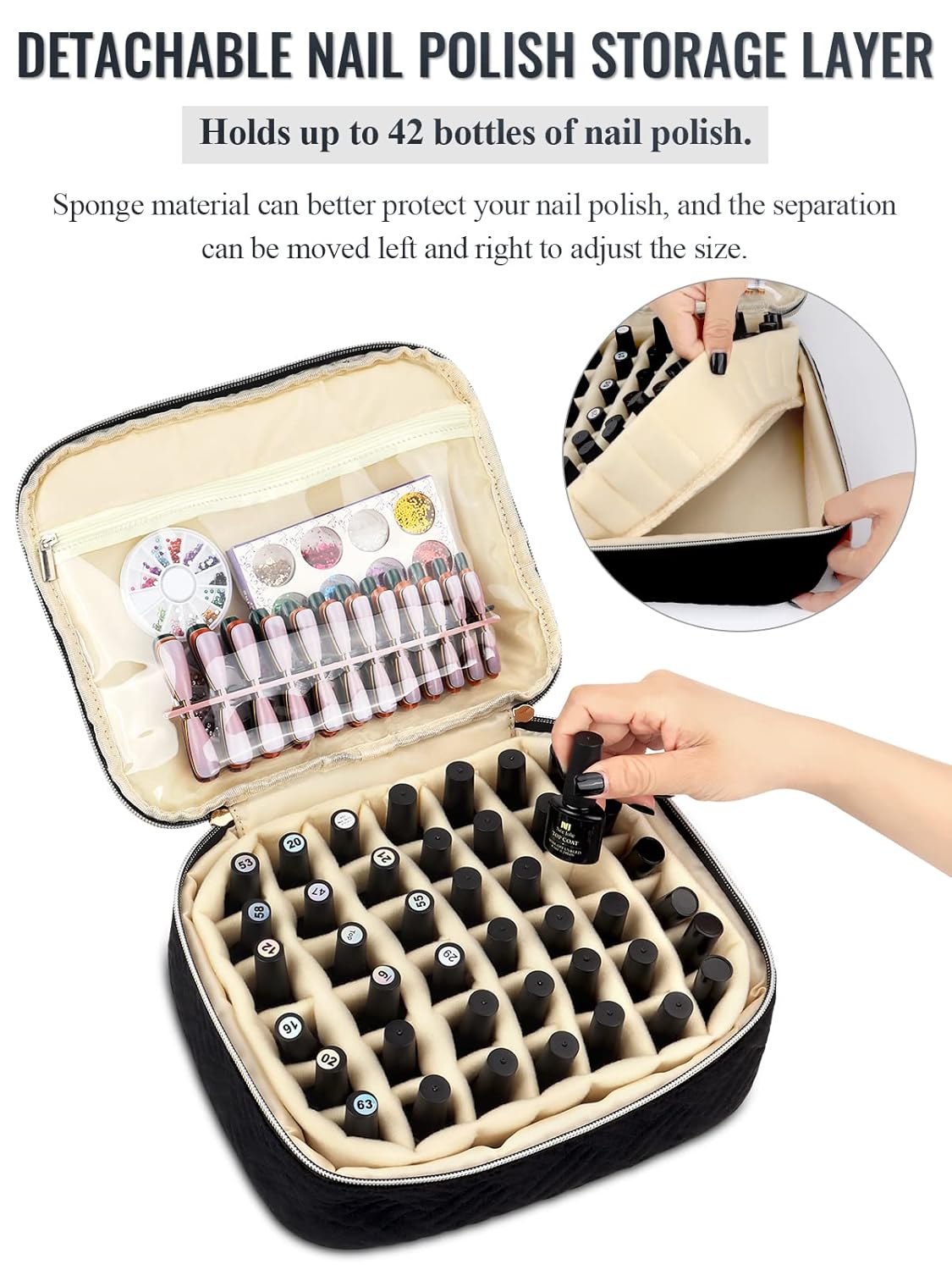 Nail Polish Organizer Case, Detachable Double Layer Nail Polish Organizer Bag Holds Up 42 Bottles, Portable Nail Polish Organizer Holder with Storage Pockets, Travel Bag Manicure Storage Bag(Black)