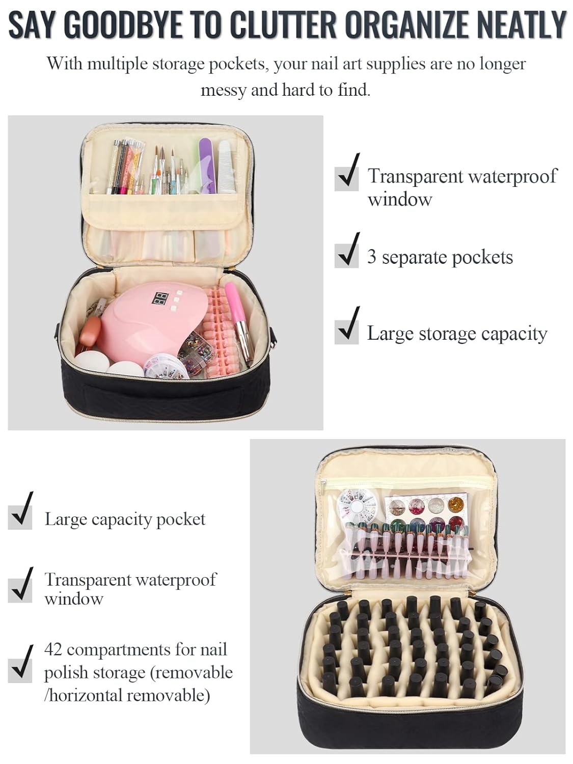 42-Compartment Nail Polish Storage Base: The nail polish bag with flexible bottle dividers holds up to 42 bottles nail polishes. The nail storage organizer box for nail tech with well padded design helps to keep the bag’s shape and provides great protection for nail polishes.