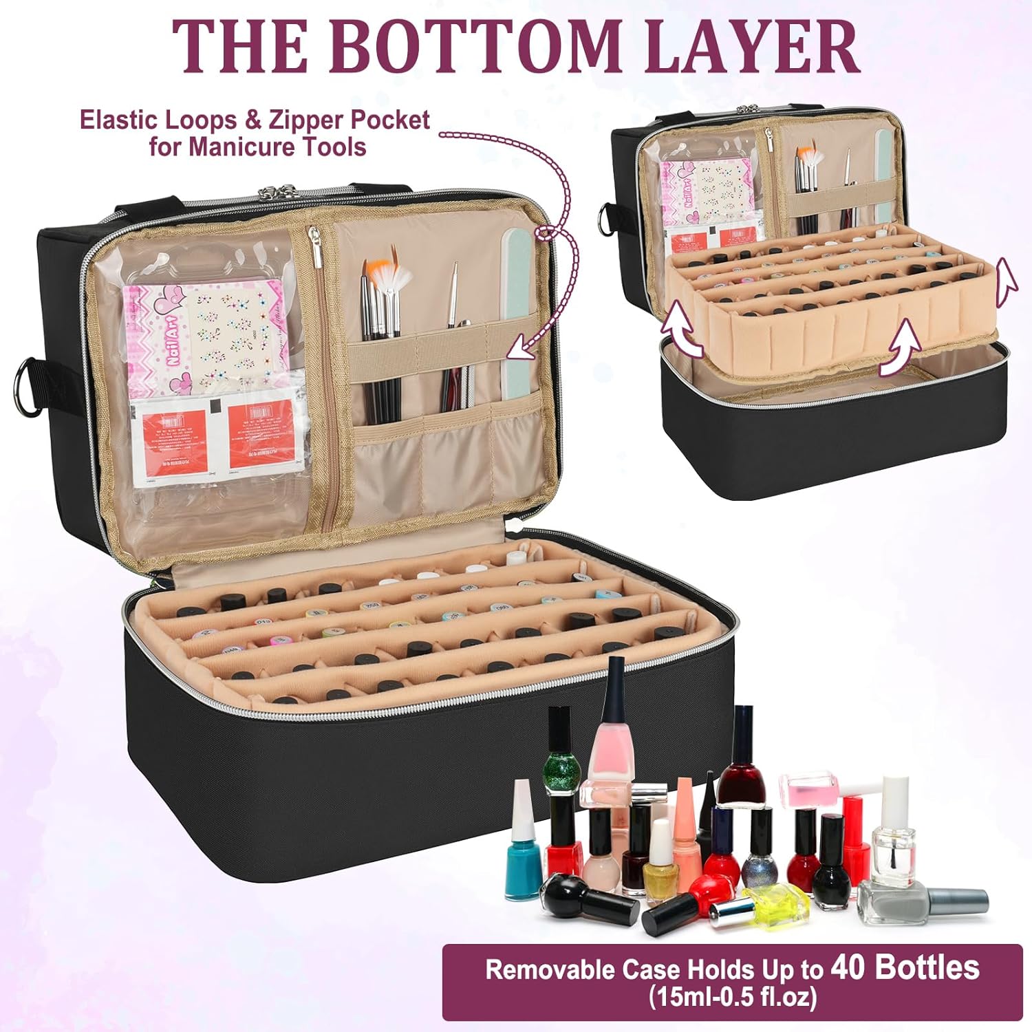 Large Capacity: This nail polish storage bag designed with double layers, the upper compartment is big enough to hold UV led nail lamp dryer, nail brush, nail clippers, etc. The bottom compartment can hold 40 nail polish bottles and nail drill kit.