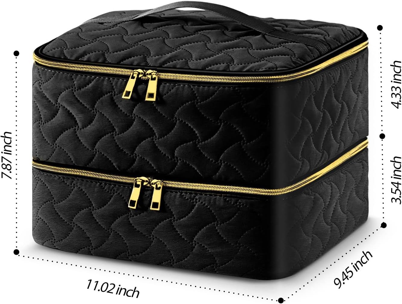 Size And Material: Size is 11.02 x 9.45 x 7.87 inches, upper layer 4.33 inches and lower layer 3.54 inches; Surface fabric is made of peach skin and inside is filled with sponge