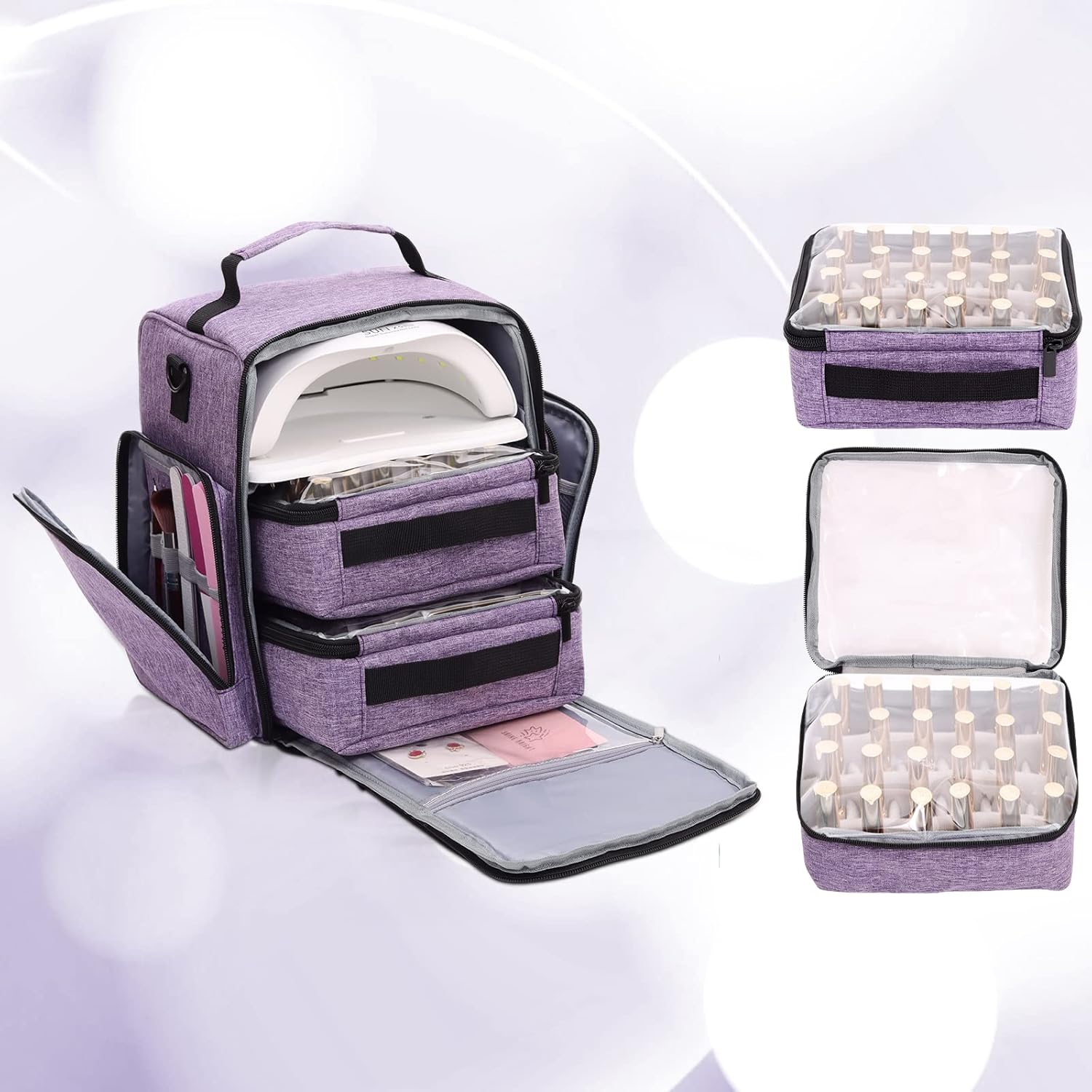 【Nail Polish Organizer Case Larger Capacity】 Contains three layers and five pockets, the first layer can put nail polish lamps , the second and third layers can put nail polish,five pockets for your all nail polish kits
