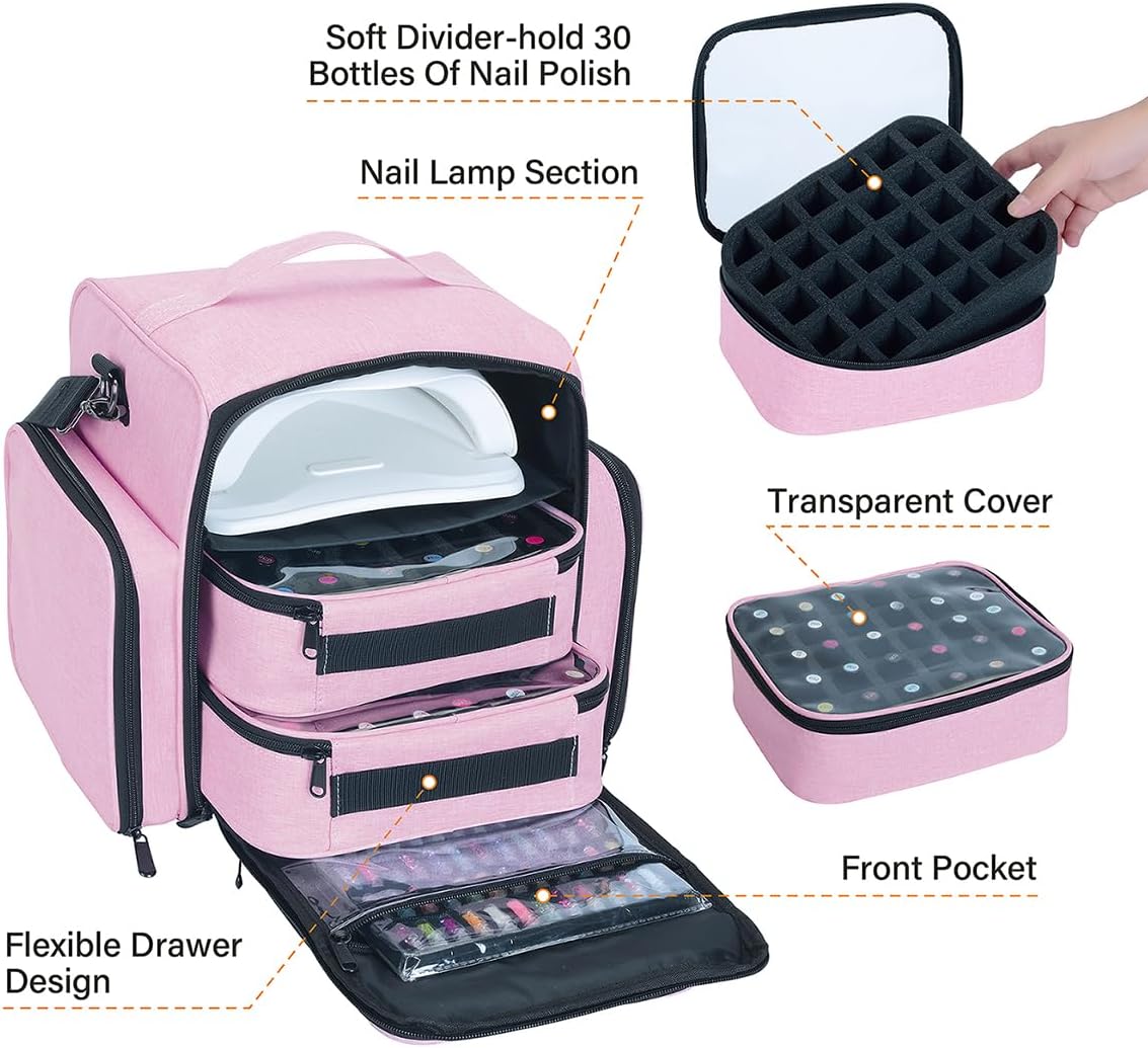 Portable Travel Case : Drawer-style design, the lower layer contains 2 removable nail polish bags, which can store a total of 60 nail polish bottles (15 ml/0.5 fl oz). (Note: the dividers are resizable and removable)