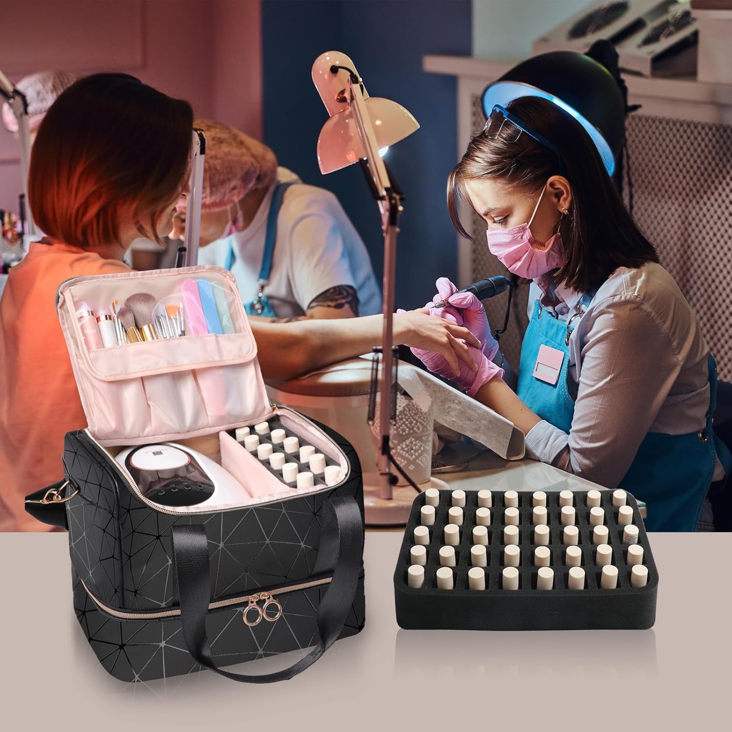 【Spacious Section to Fit Large Nail Dryer】The top compartment of nail bag organizer case is large enough to hold a big size nail lamp. It can effectively partitioned storage and prevent clutter with 2 Velcro cushions. With dust proof lip and side mesh pocket, it is convenient storage of various nail manicure tools.
