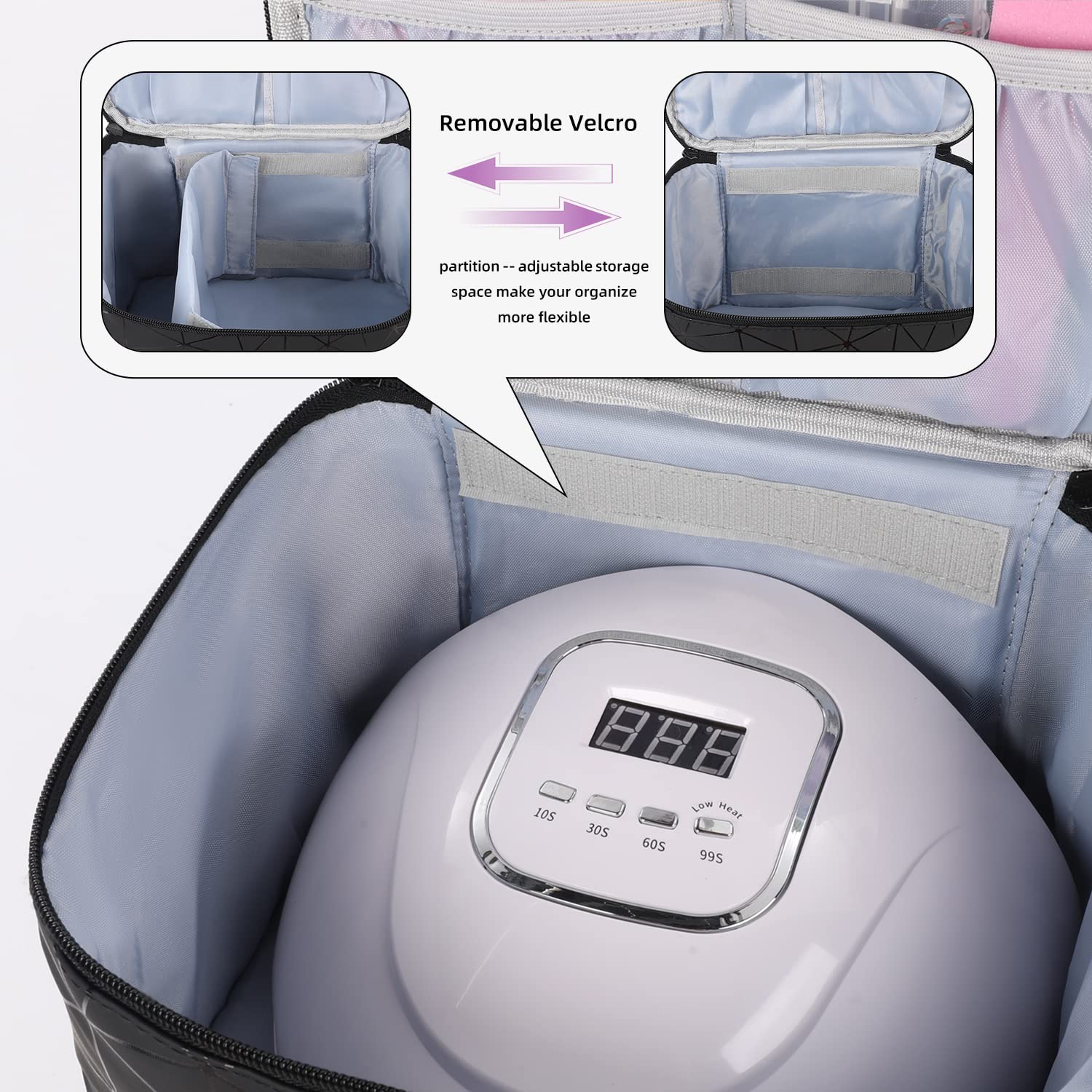 EASY TO CARRY: Reinforced handle on top ensures the nail polish bottles to be carried evenly and uprightly. Professional nail polish storage, convenient to carry out, also very suitable for family storage. Dimension- 9 x 8x 9.5 inch. Please take care to measure the size of your nail lamp before you buying, Avoid lamp size larger than bag’s.