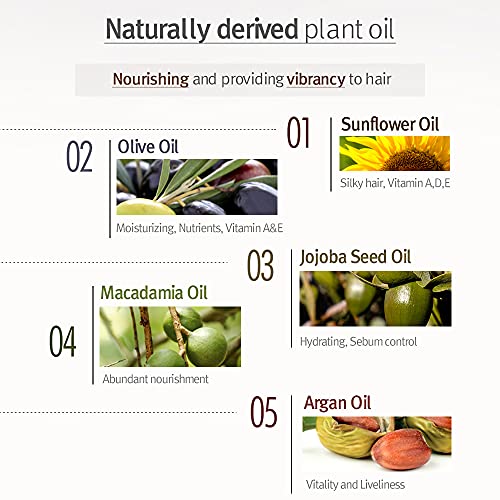 ???? 5 NATURAL OILS FOR NUTRIENTS – By Sunflower Oil, Olive Oil, Jojoba Seed Oil, Macadamia Oil and Argan Oil form a moisturizing film to prevent the hair from moisture loss and delivers deep nutrients to the hair’s cells therefore improve hair’s texture, elasticity and strength.