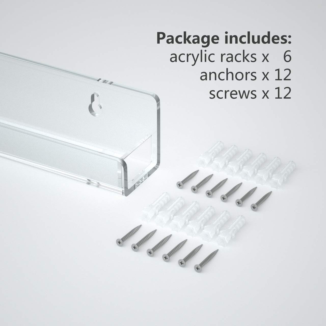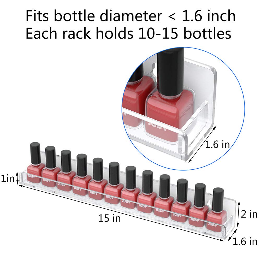 SET OF 6 TIER – It comes with 6 pieces of nail polish organizer wall, each wall floating shelf is individual, can be mounted separately or as a combo of 2 or 3 racks with the included screws and anchors. It measures 15″ x 1.6″ (Length x Deep), holds about 10-15 bottles.