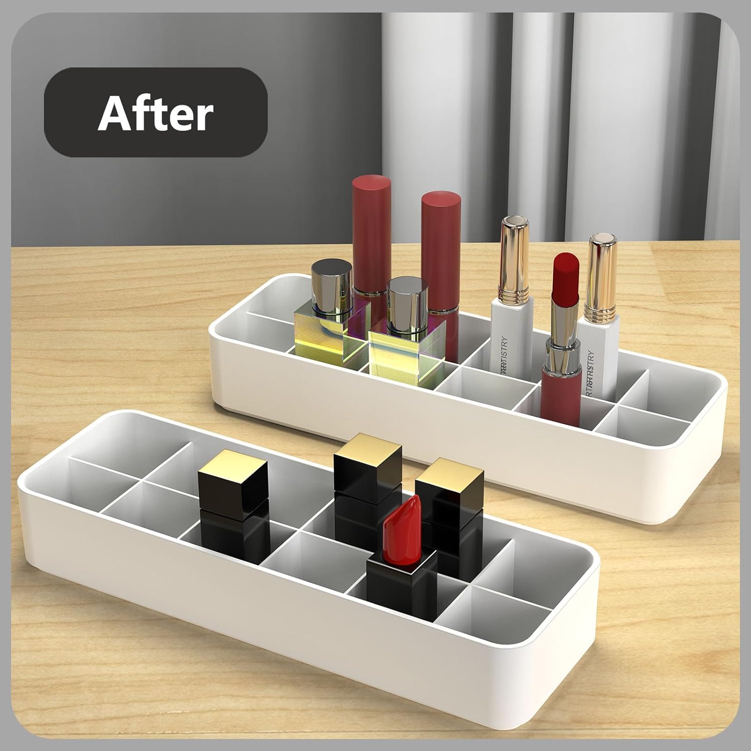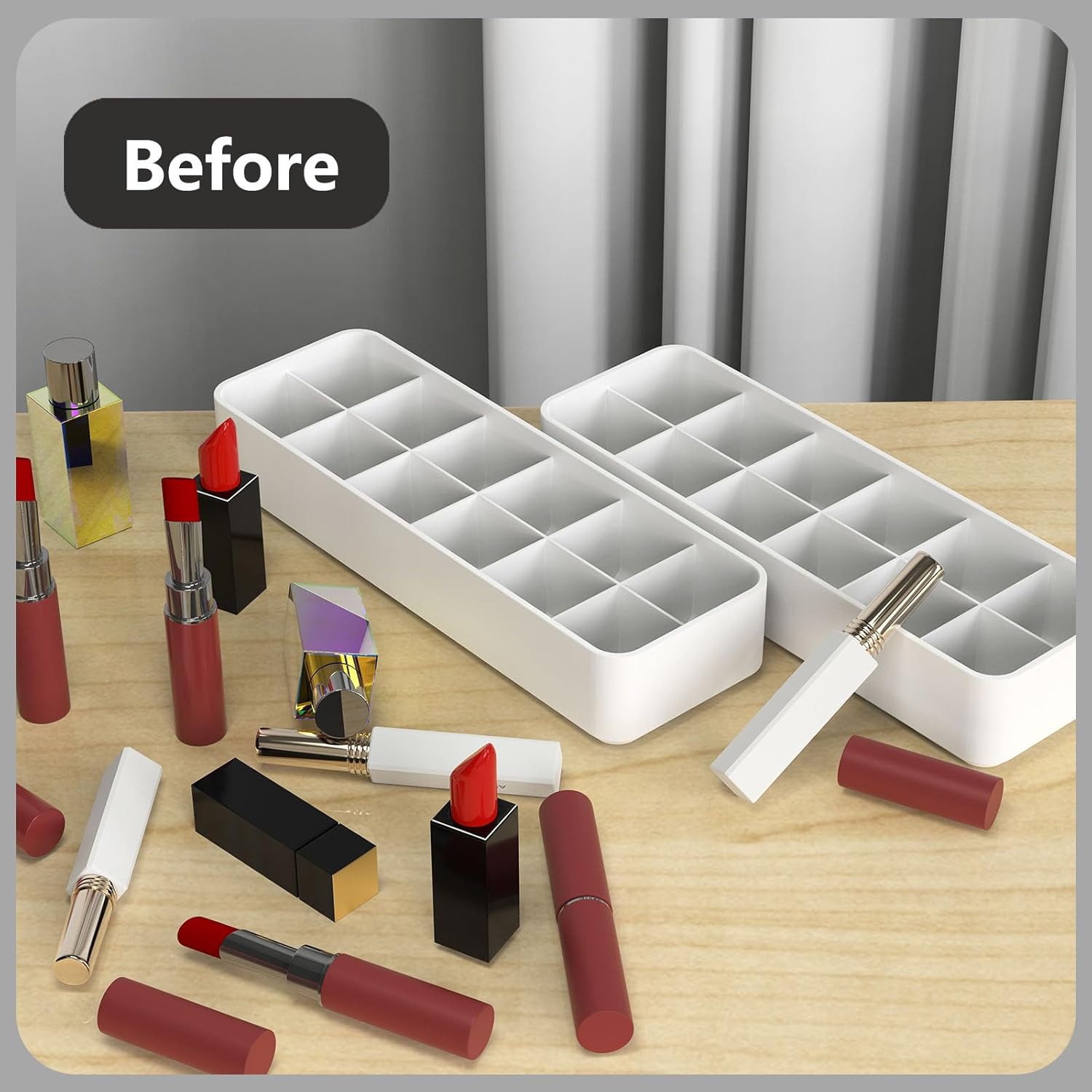 24 SLOTS LIPSTICK ORGANIZER: 2-Piece Stackable cosmetic organizer for storing beauty products: lipsticks, lip glosses, nail polish, mascara tubes and more. Perfect solution for organizing items and keeping the vanity neat and clean.