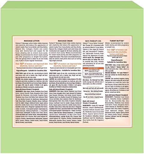 Palmer’s Cocoa Butter Formula complete stretch mark care kit provides a Pre-Natal skincare regimen that helps to visibly improve skin elasticity and reduce the appearance of stretch marks that occur during and after pregnancy, or due to significant fluctuations in weight. &Nabs; from the #1 brand for stretch marks, Palmer’s Cocoa Butter Formula, This set includes massage Lotion, Cream, tummy butter balm and a bonus skin Therapy Oil. &Nabs; massage Lotion for stretch marks, which can be used in place of your regular moisturizer, is an all-over body Lotion that helps visibly improve elasticity and reduce the appearance of stretch marks. &Nabs; massage Cream for stretch marks is a super targeted Cream concentrate that is ideal for stretch mark prone areas such as your tummy, thighs, hips & bust. &Nabs; this is best to layer over your Palmer’s Massage Lotion. &Nabs; the tummy butter for stretch marks, which is best used at nighttime or whenever your skin needs more thorough care, is an intensive treatment body butter widely recommended for stretch marks during or after pregnancy or weight fluctuations. &Nabs; made with plant based ingredients for beautiful skin, All Palmer’s Stretch mark products are hypoallergenic and free of mineral oil, Parabens, phthalates, fragrance allergens, and artificial dyes. &Nabs; and lastly, the bonus bottle of skin Therapy Oil for body helps to improve the appearance of scars, stretch marks, dry, damaged skin, uneven skin tone, aging skin, and fine lines and wrinkles. &Nabs; this preservative-free, lightweight, non-greasy formula will help leave your skin looking and feeling instantly soft and smooth.