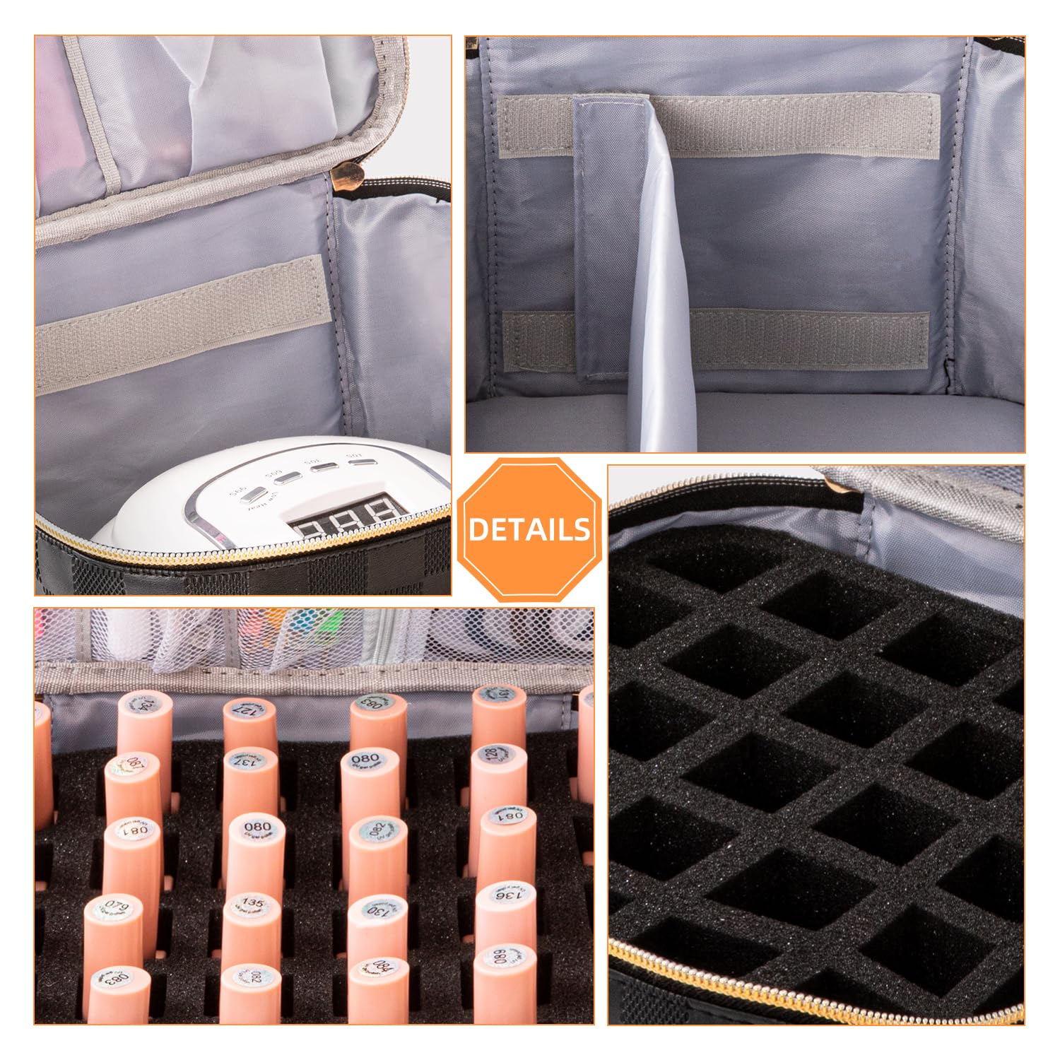 Portable Nail Polish Organizer Bag with UV Light Case – Holds 30 Bottles and 1 UV Nail Lamp, Double-Layers Nail Dryer Case for Gel Nail Polish Kit, Nail Art Decorations(Checkered Black)