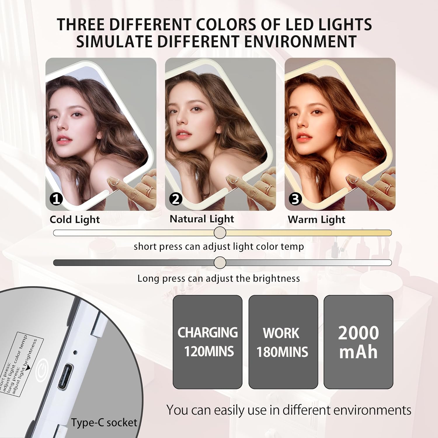 Charged 3 Color Mirror: provides three lighting modes. Touch screen long press can adjust the brightness from 0%to 100% to meet different light conditions. One week of charging, the LED mirror is equipped with a 2000mAh battery. Convenient for going out to use