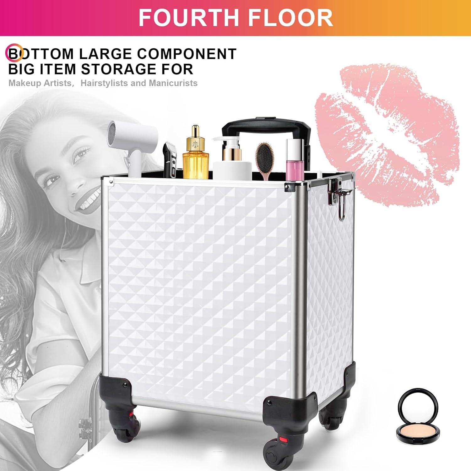 Professional 5-In-1 Rolling Makeup Train Case, Large Makeup Travel Case with Key Shoulder Strap/Handle Cushion,Makeup Train Case Organizer,Cosmetology Case on Wheels I White