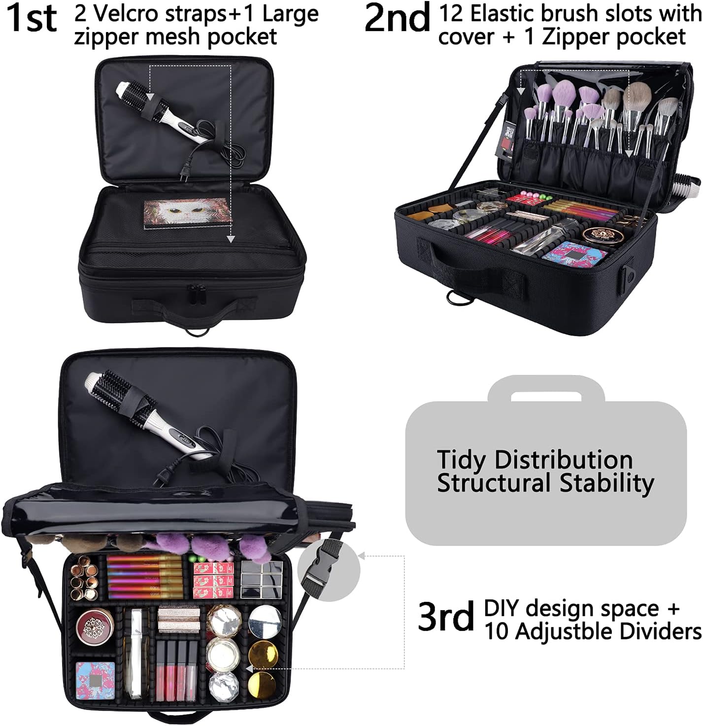 Professional Travel Makeup Case 16.5 Inches Large Make Up Bag Cosmetic Train Case Portable Artist Storage Organizer Bag with Shoulder Strap for Makeup Brushes (L-Black)