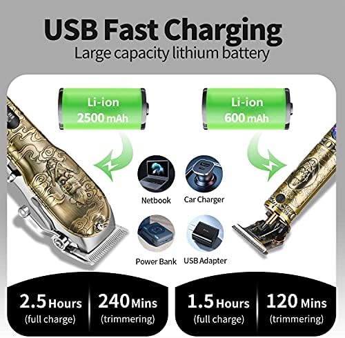 ✂ Intelligent LED Display & High Capacity Battery: The LED displays can clearly display the remaining battery percentage, speed, fuel quantity reminder, and charging reminder. The large hair clippers has a large 2500mAh Li-ion battery, which can be used for 240 minutes after 2.5 hours of charging. The battery capacity of the small trimmer is 600mAh, and it can be charged for 1.5 hours and used for 120 minutes. Haircut trimming operation saves more time and more effort.