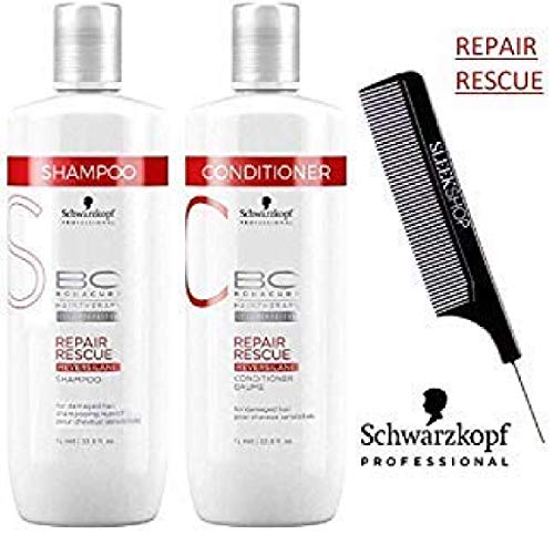Schwarzkopf BC Bonacure REPAIR RESCUE SHAMPOO & CONDITIONER Duo SET for FINE TO NORMAL DAMAGED HAIR (with Sleek Steel Pin Tail Comb) (33.8 oz / 1000 ml – LARGE LITER DUO KIT)