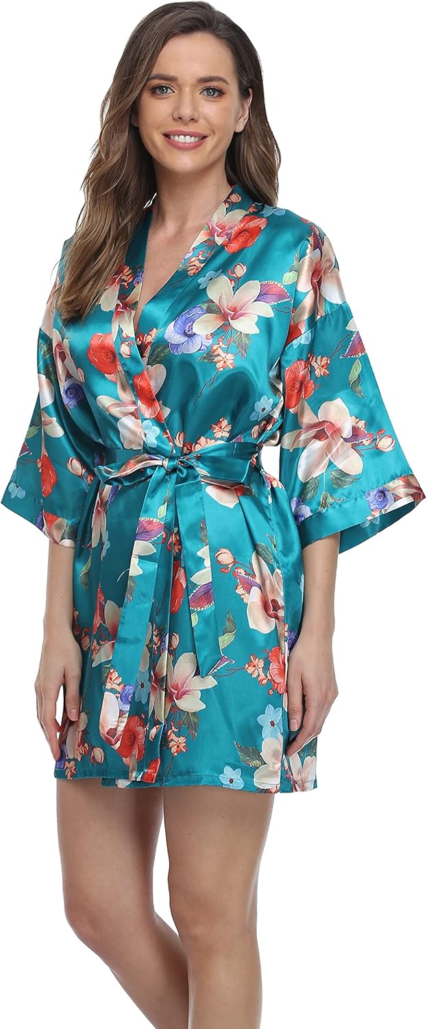 season dressing Women’s Floral Satin Kimono Robes Bridesmaid and Bridal Short Silky Robe Sleepwear for Wedding Party
