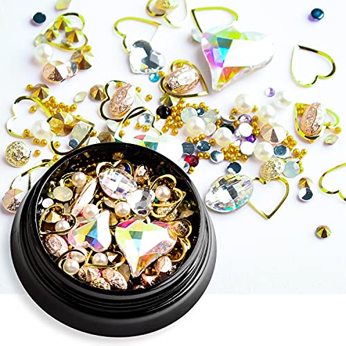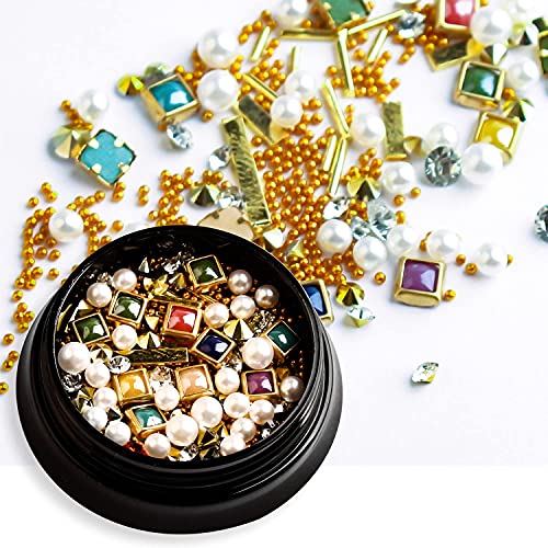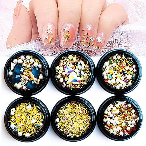 SILPECWEE 6 Boxes 3D Nail Charms Gold Nail Studs Nail Art Rhinestone Nail Jewels Big Gem Pearls Nail Decoration Kit With 1Pc Tweezers, Picker Pencil
