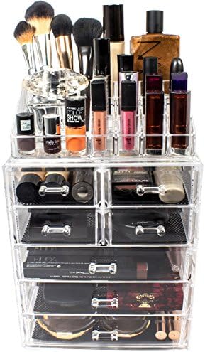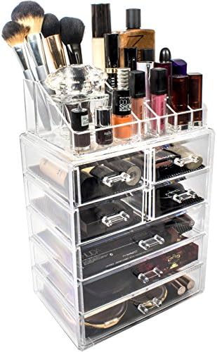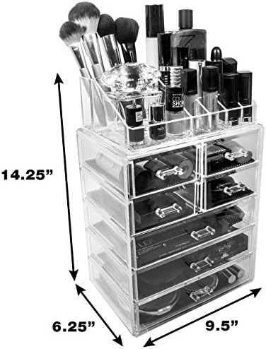 Make your life a little bit easier with Sorbus Acrylic Cosmetic and Makeup Storage Case Set that organizes all your favorite makeup essentials into your own makeup and cosmetics beauty counter! This sturdy, clear acrylic makeup organizer set includes a makeup case with 3 large drawers and 4 small drawers and an organizer top that has 16 sections to fit various cosmetic items of varying sizes. The 2-piece set interlocks when stacked together to fit properly and securely and easily detaches to be used separately. It features removable black mesh padding that keeps makeup items protected and in place. The organizers feature handles that slide the drawers in and out smoothly making these drawers completely removable for ease of use. We have created a set that is sure to organize your favorite makeup essentials into a dazzling makeup set.