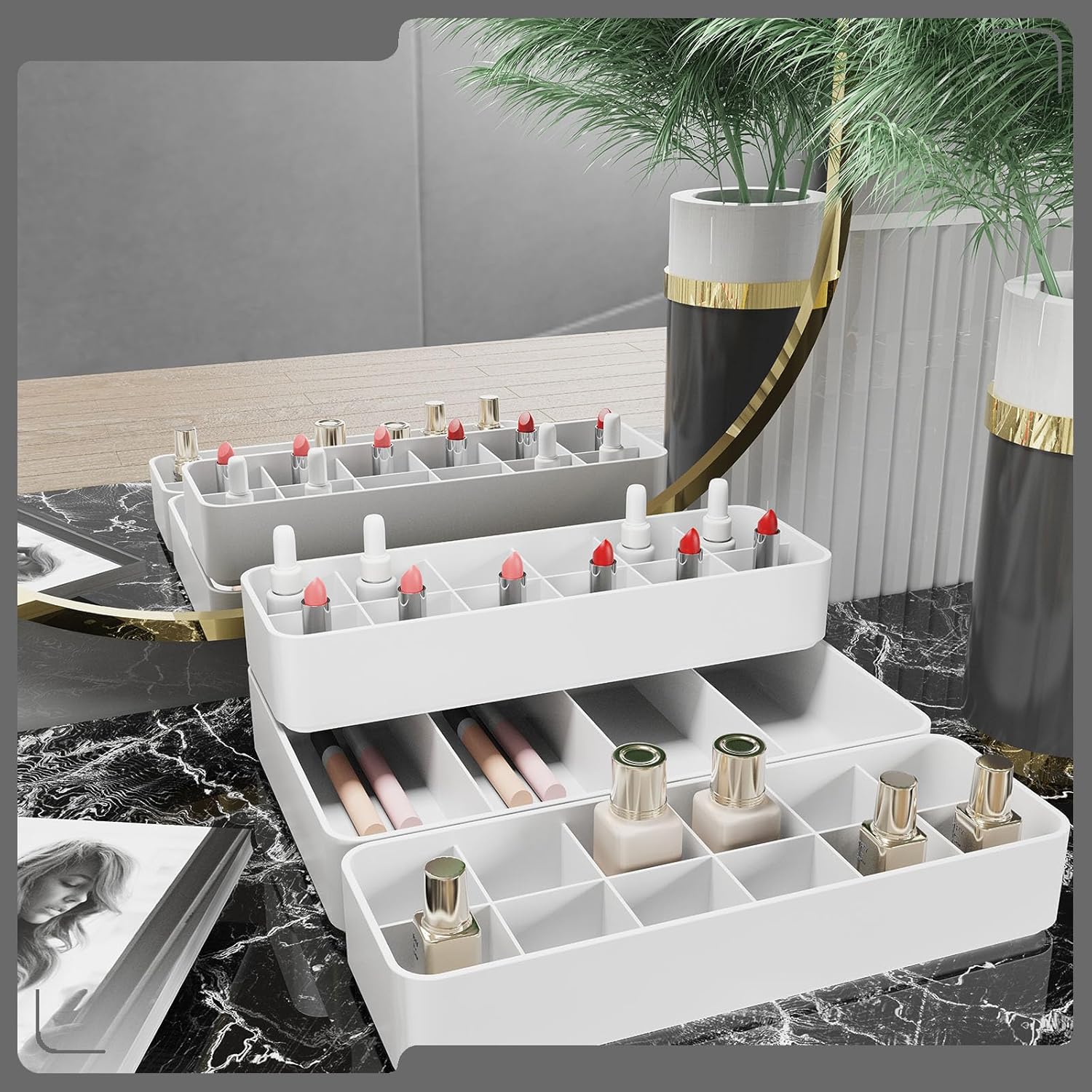 Stackable Drawer Organizer, 3 PCS Versatile Bathroom and Vanity Drawer Organizers Trays Makeup Organization and Storage Set for Lipstick, Lip Gloss, Nail Polish, Cosmetics, Skincare, Jewelry, White