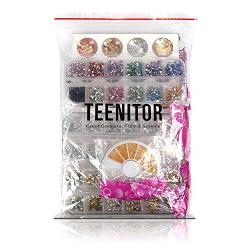 Teenitor Professional Nail Kit with 6 Boxes Nail Art Rhinestones& 1 Box Nail foil chip, Multi-Size Gems Metal Nail Rivets Studs Double-Sided Color Nail Art Foil Pailette Chip Foil Flake