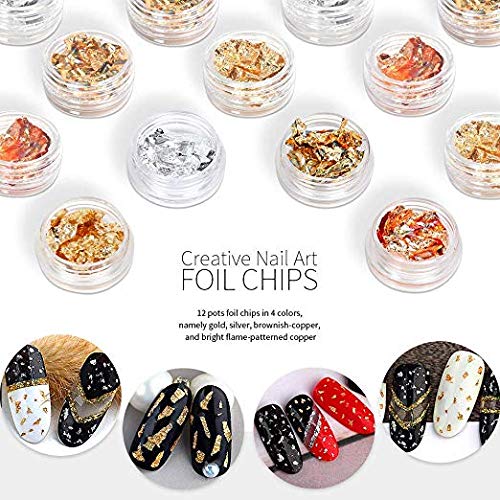 Foil Chips: 12 pots creative nail art foil chips, with golden, silver, rainbow & copper colors in different shapes and sizes, easy to create your grandeur unique style, perfect for nail art decoration