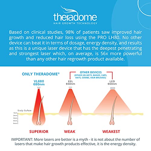 SAY GOODBYE TO HARMFUL CHEMICALS OR TREATMENTS & SIDE EFFECTS – Theradome’s advanced hair growth technology: effective cold lasers, powerful red light, optimal energy dosage, & maximum therapy. This is the only hair growth laser of its kind & 56x more powerful than the other options. It penetrates deep enough to stimulate the hair follicle for hair growth scalp treatment. This light therapy is clinically tested and FDA cleared as safe and effective for OTC (Over-The-Counter) sale in the US.