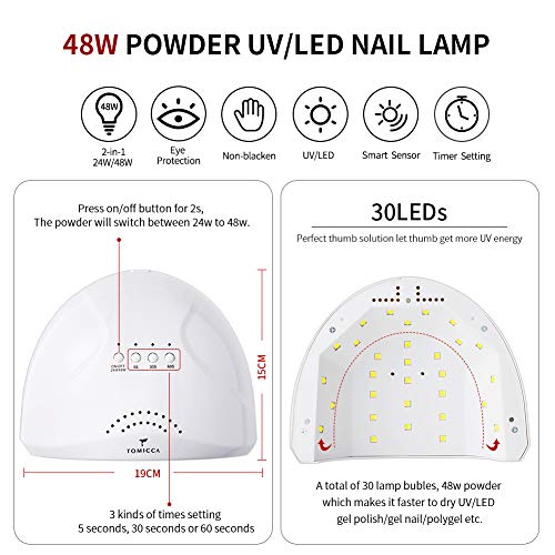 TOMICCA 48W Nail Lamp: TOMICCA higher power light can cure all kinds of gel nail polish, make 5 fingernails simultaneously dry, 30 LEDs cut curing time in half! TOMICCA UV nail lamp intelligently make your nail polish dry more efficiently and conveniently.