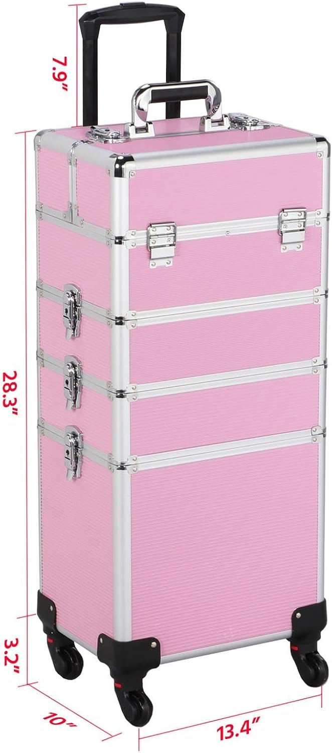 Topeakmart 4 in 1 Professional Makeup Rolling Case, Large Aluminum Cosmetic Train Case, Makeup Tavel Case Travel Beauty Organizer – Pink – with Removeable Wheels