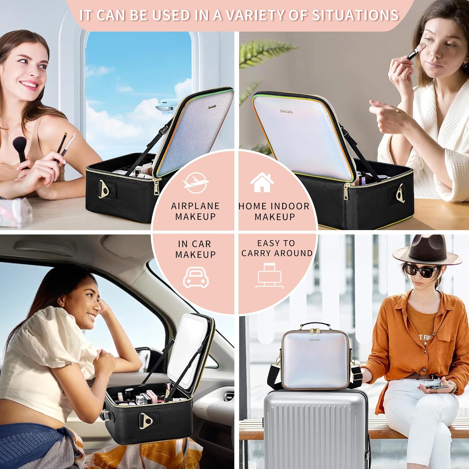 Travel Makeup Bag with LED Mirror, Makeup Train Case with Light Up Mirror, Portable Makeup Artist Organizer with Adjustable Dividers, Makeup Brushes Holder Storage