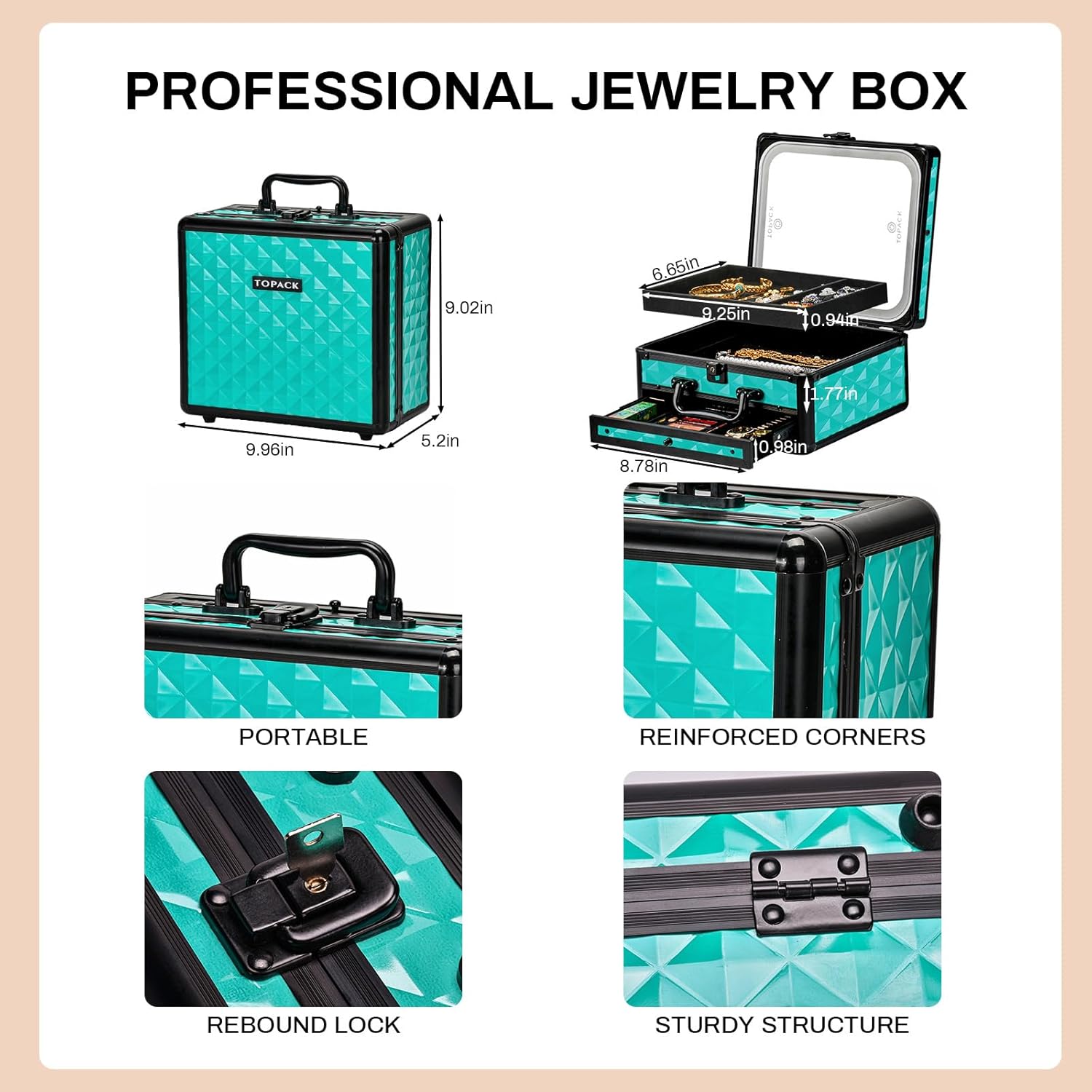 【SIZE & MULTI-COMPARTMENTS】Travel Makeup Bag with Led Mirror: 10*9.6*5.5 (inch);LED Mirror Size: 9.4*8.3 Inches;Jewelry Holder Size: 9.4*6.7*0.98;Bottom Drawer Size: 7.87*7.87*0.78;no worry about the messy cosmetic and jewelry any more while get the makeup jewelry case organizer,satisfy almost demands for beauty protection and jewelry case!