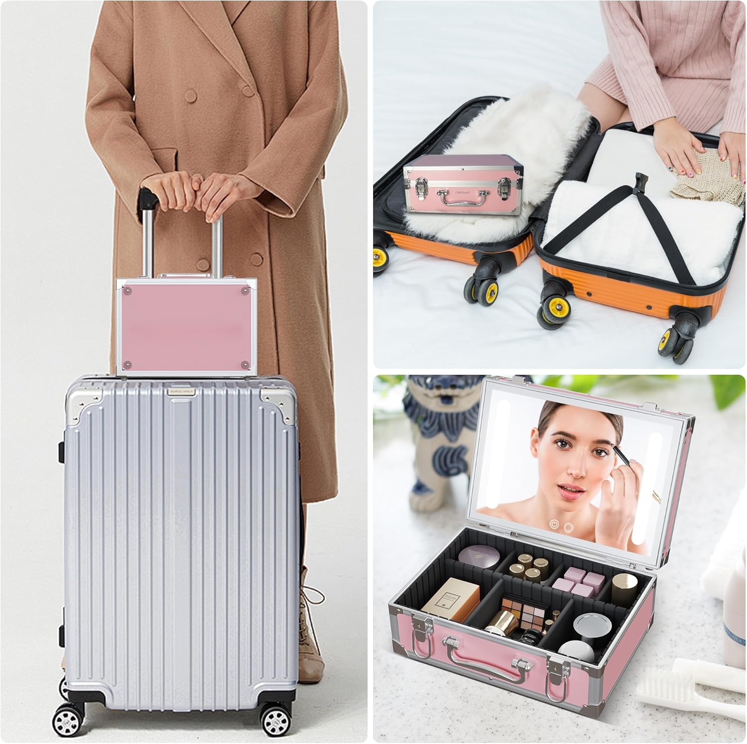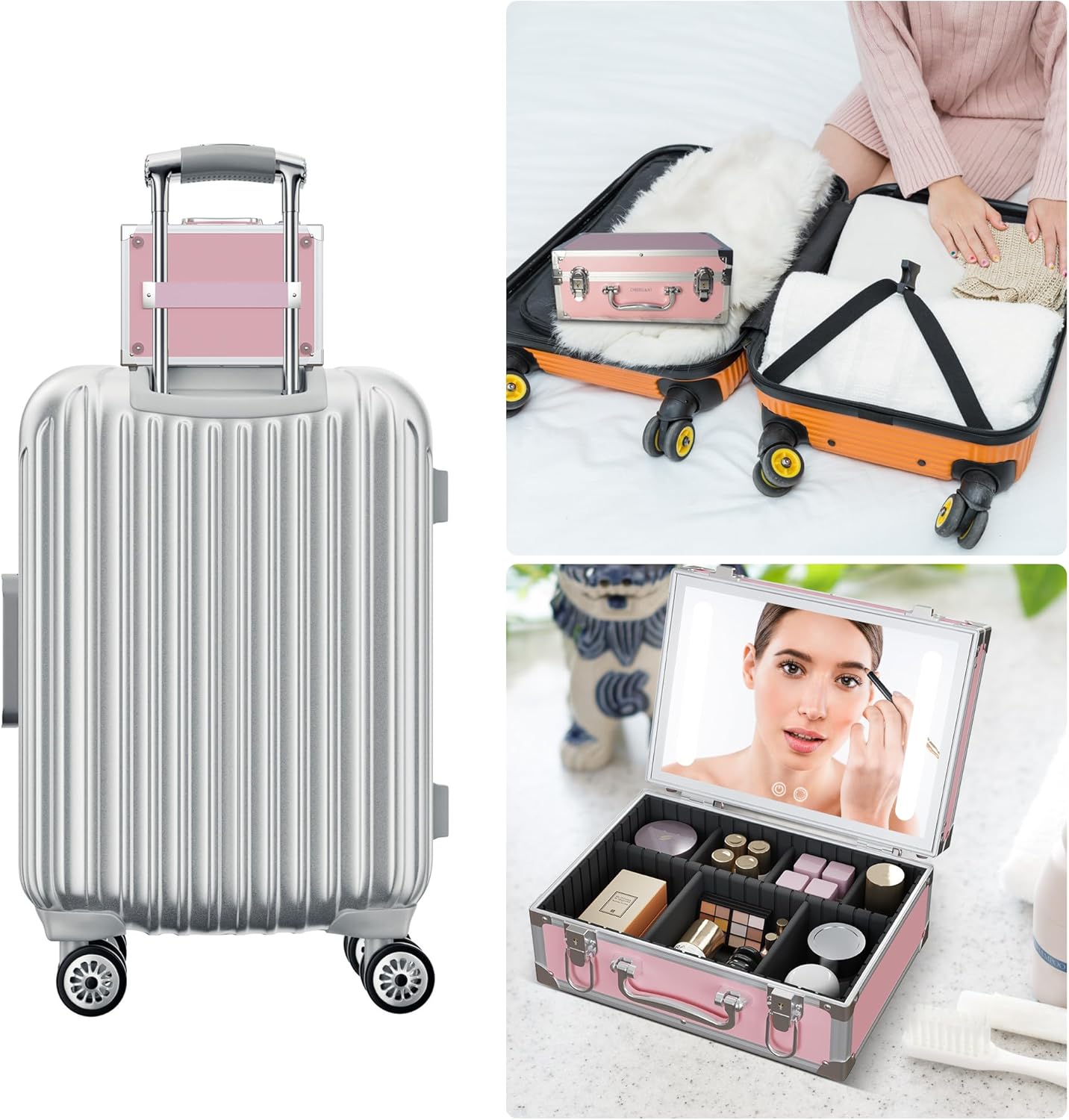 FUNCTIONAL & STYLISH TRAIN CASE: Combining both a travel vanity and LED makeup bag in one, this travel makeup case is not only perfect for travel but also great for daily use. The sleek pink exterior adds a touch of glamour to your makeup routine