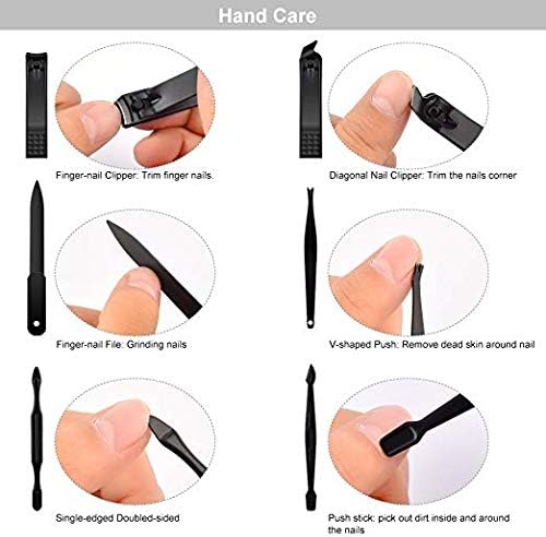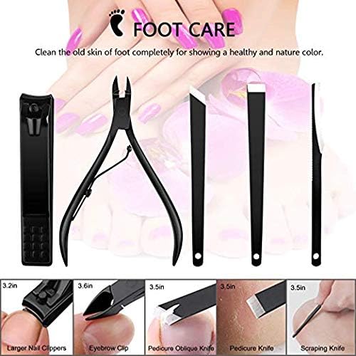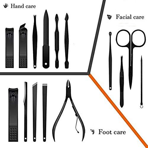 1 * Leather Storage Case *Nail Care* 1 * Nail Clipper 1 * Slanted edge Nail clipper 1 * Nail file for polishing nails smooth 1 * Peeling Knife 1 * Cuspidal /Obtuse push-type broach 1 * V shaped Push Stick *Face Care* 1 * Eyebrow Scissors for eyebrow and nose hair 1 * Ear Pick 1 * Blackhead Acne Needle 1 * Eyebrow Tweezer for tidying eyebrow *Foot Care* 1 * Toenail Nipper for ingrowing or thick toenails 1 * Straight Pedicure Knife 1 * Diagonal Pedicure Knife 1 * Scraping knife for scraping foot dead skin 1 * Larger Nail Clipper for toenail cutting.
