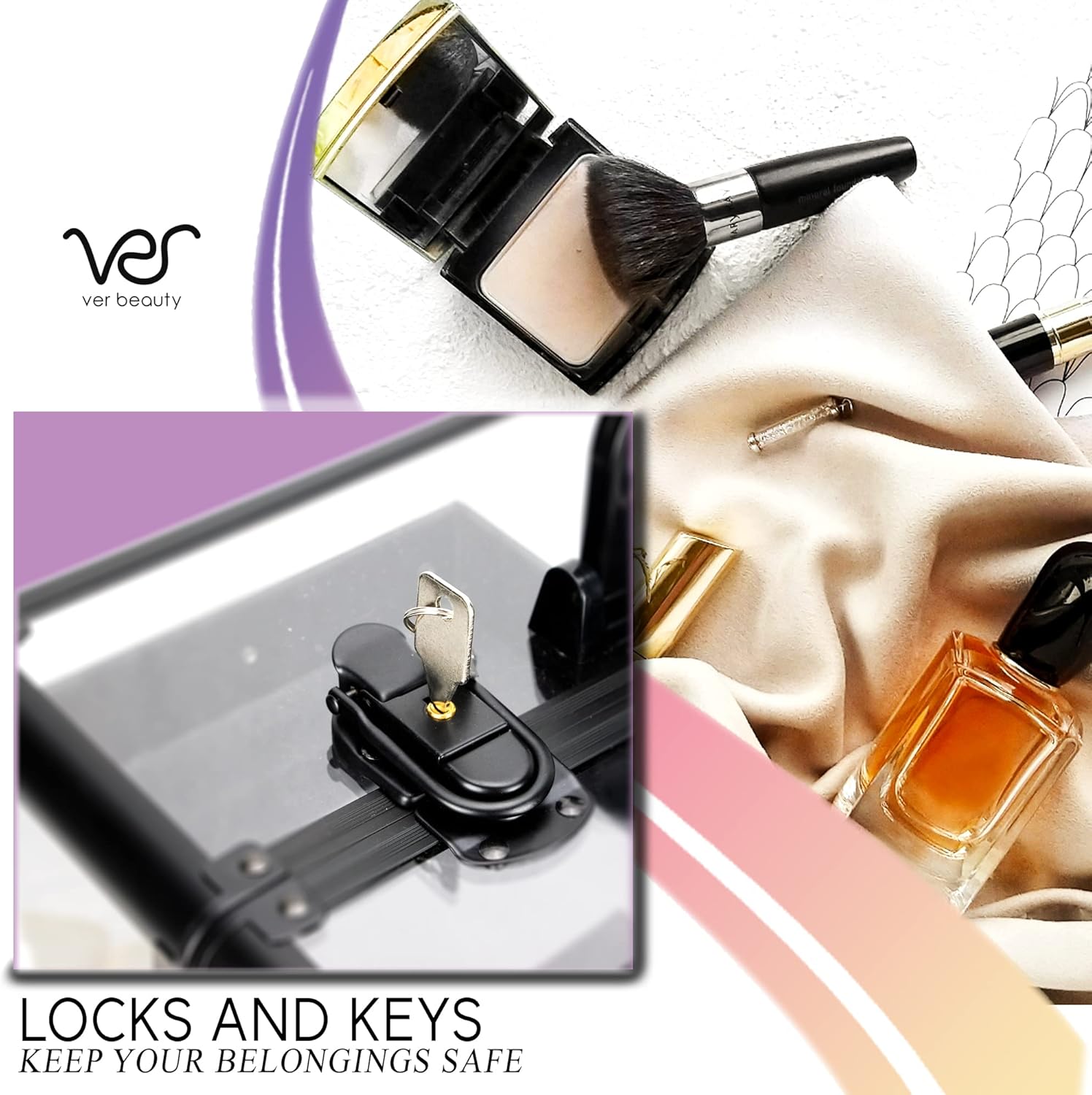 Constructed with the professional in mind, it features robust transparent acrylic top panels and reinforced steel corners for durability, alongside a stylish aluminum finish for a touch of sophistication. The sturdy handle and easy-close latches with key locks provide both comfort and security, ensuring your makeup arsenal is protected wherever you go.