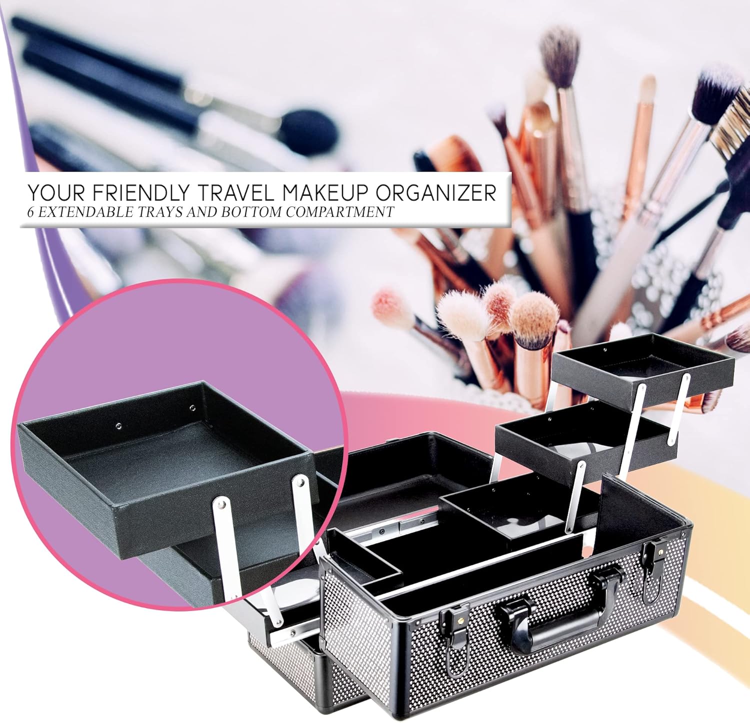 Makeup Organizer, Cosmetic Travel Kit, 6 Extendable Trays, Lockable Storage Box, Makeup Train Case, Aluminium Case, Impact & Scratch Resistant Makeup Vanity Box.