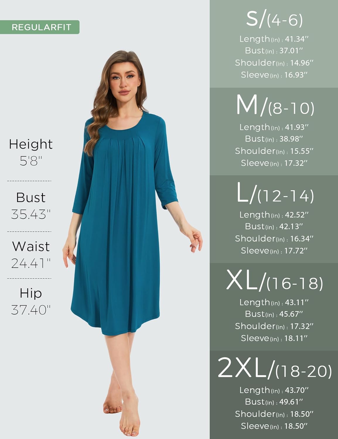 Womens Long Nightgowns Soft Bamboo Viscose 3/4 Sleeves Pleated Sleepshirts Ladies Sleepwear Gown for Mom