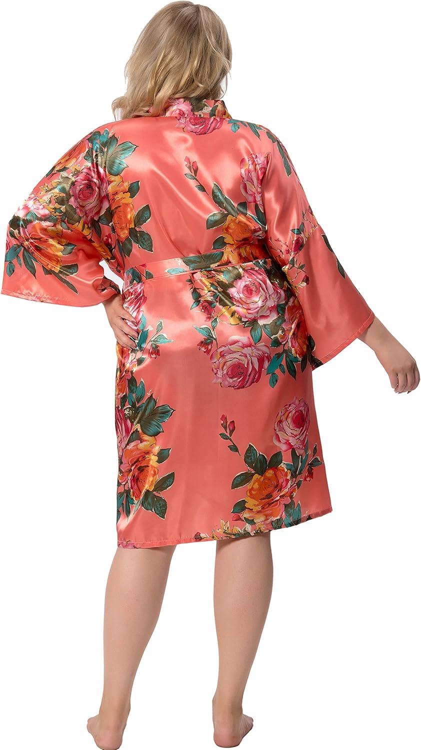Women’s Rose Flowers Silky Satin Short Kimono Robe for Wedding Getting Ready