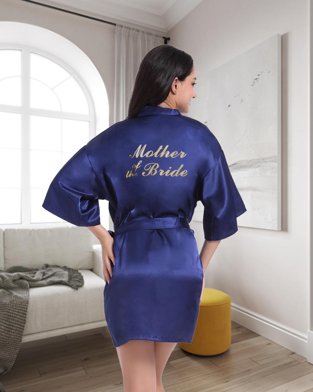 Pure color and 3/4 sleeves.Mid-Thigh Length, Short style.Oblique v-neck, Adjustable & Removable waist belt and Inside tie closure.Gold Glitters designed “Bride”, “Bridesmaid”, “Maid of Honor”, “Mother of the Bride”,”Matron of Honor”, Mother of the Groom” decoration on back. A must-have for wedding.