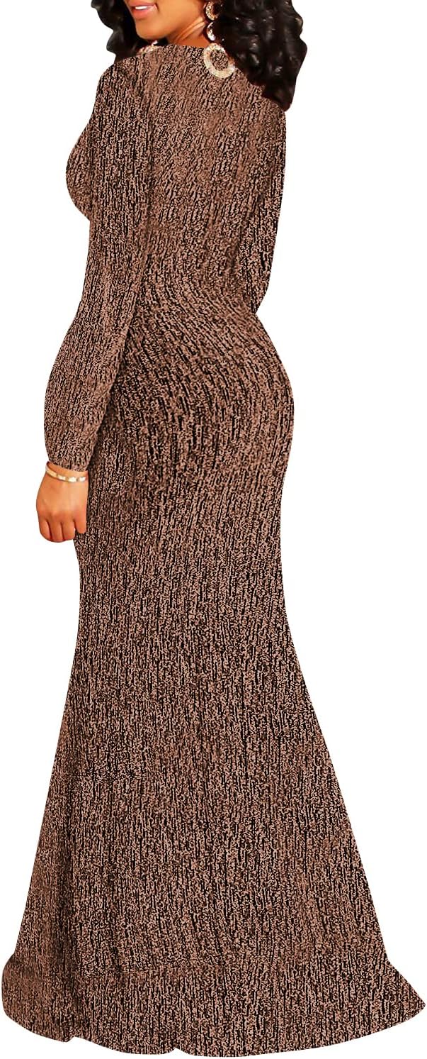 Women’s Sexy Long Sleeve Sparkly Maxi Dress V Neck High Slit Wrap Formal Gown Cocktail Glitter Maxi Long Dresses