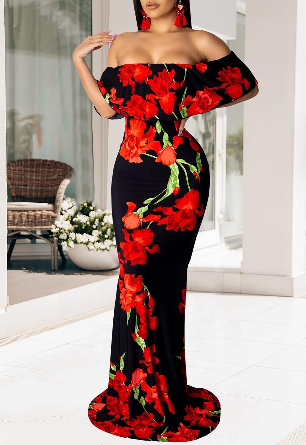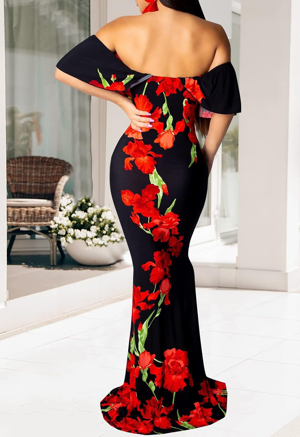 Women’s Sexy Off Shoulder Maxi Dress Hawaiian Floral Evening Gown Long Dress